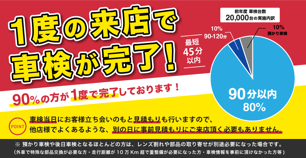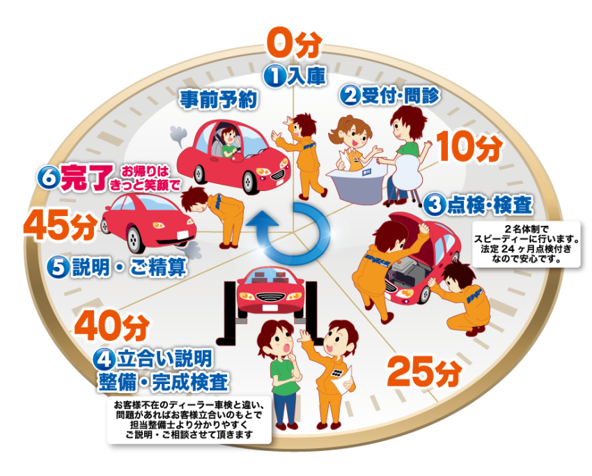 作業内容は、カーディーラーと同様の内容になりますが、当店では最短45分で車検が完了します。