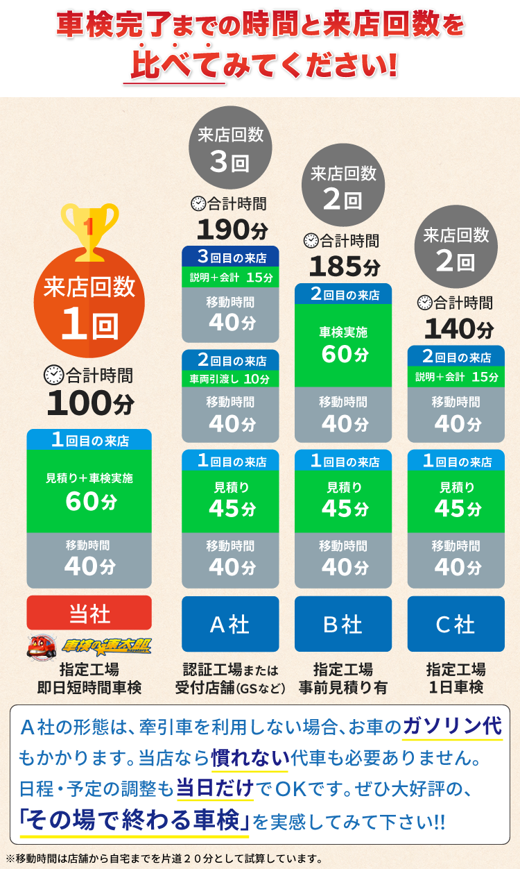 「車検の速太郎」小松店・能美店は、短時間車検を基本としておりますが、